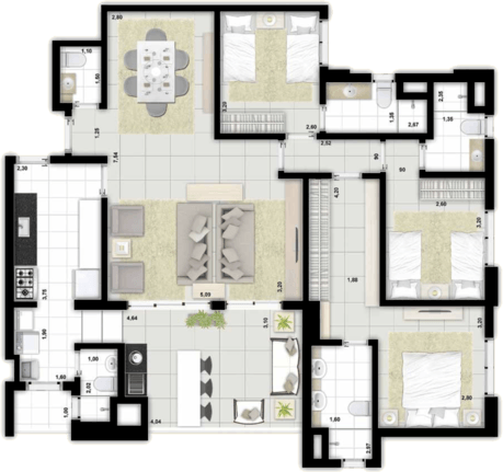 Planta de 126,87m², com 4 dormitórios (2 suítes), closet e varanda técnica
