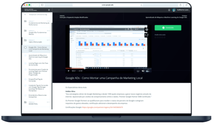 No curso nós esclarecemos de forma bem didática sobre os canais (pesquisa, display, busca) e colocamos todas as documentações necessárias do Google ADs no caso de dúvidas relacionadas para você ter todos os caminhos. O objetivo é apresentar nossas experiências (fazemos isso de forma prática e teórica) para que te sirvam como atalhos.